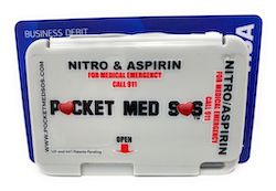 That is why we created the PocketMedSOS™, a patent-pending container featuring double seals to keep the aspirin and nitroglycerin separate and airtight, in a size similar to a credit card. The PocketMedSOS™ can fit in the credit card slot of your wallet or purse or using the lanyard hole, worn around the neck or on a keychain. PocketMedSOS™ is the most convenient way to carry your cardiac life-savers.